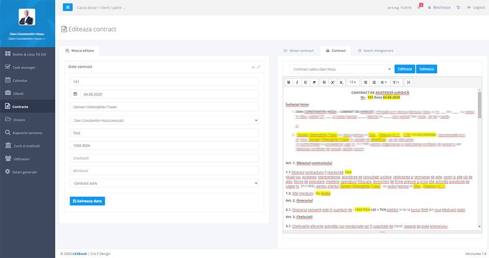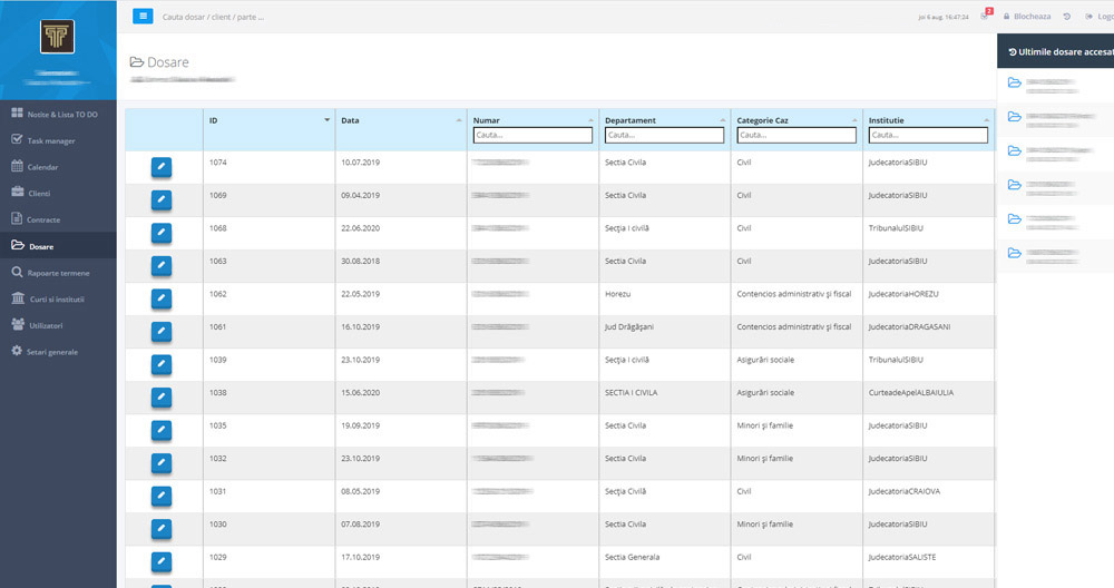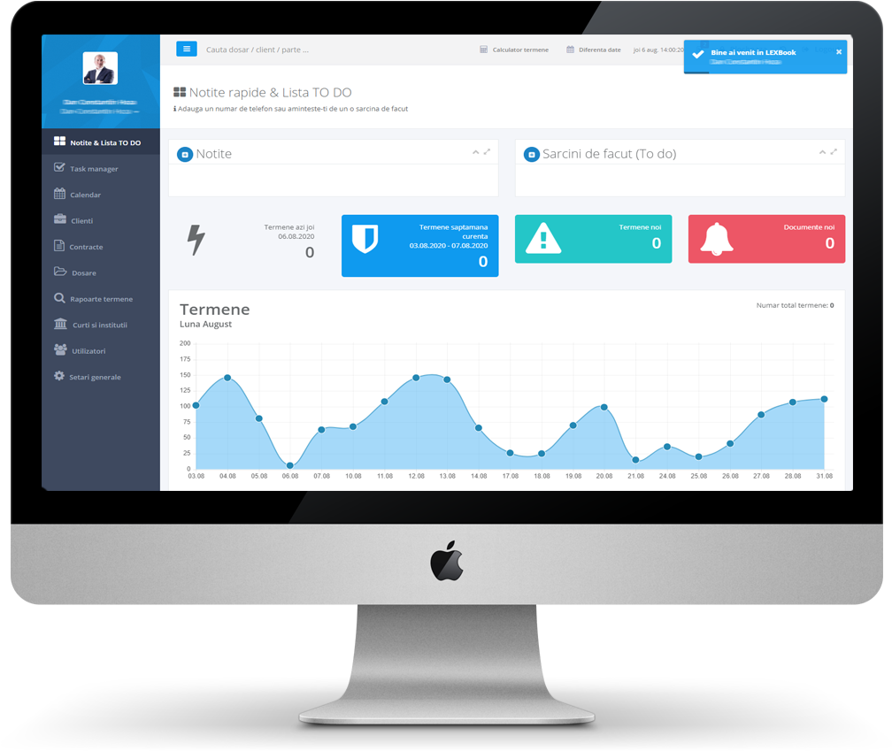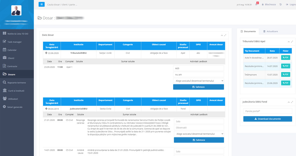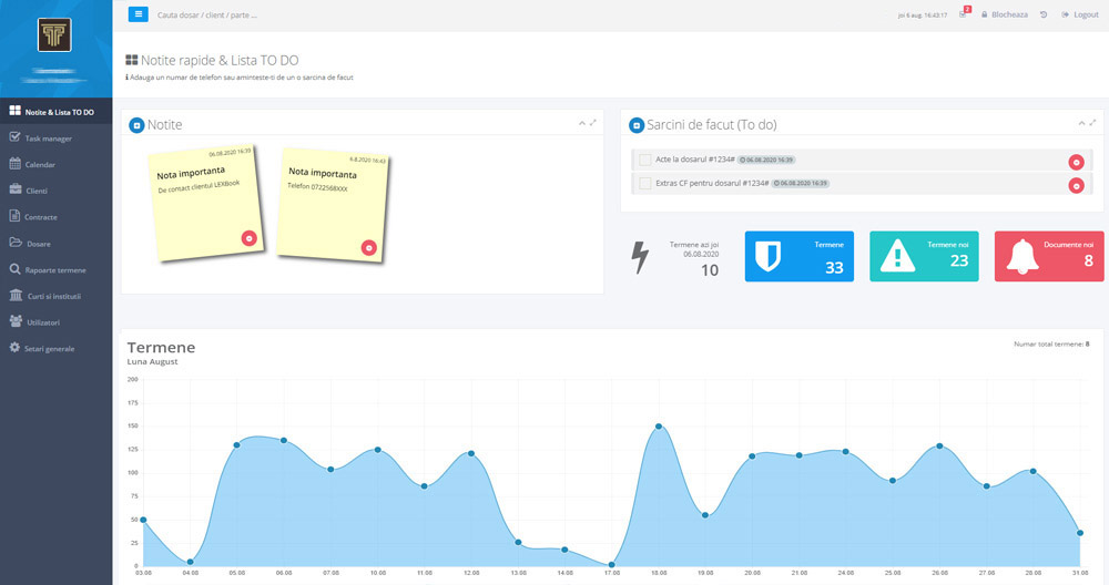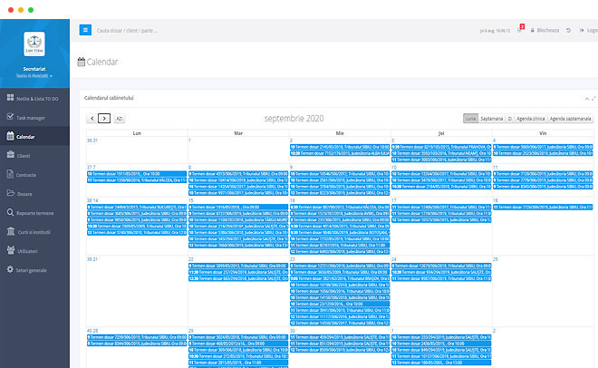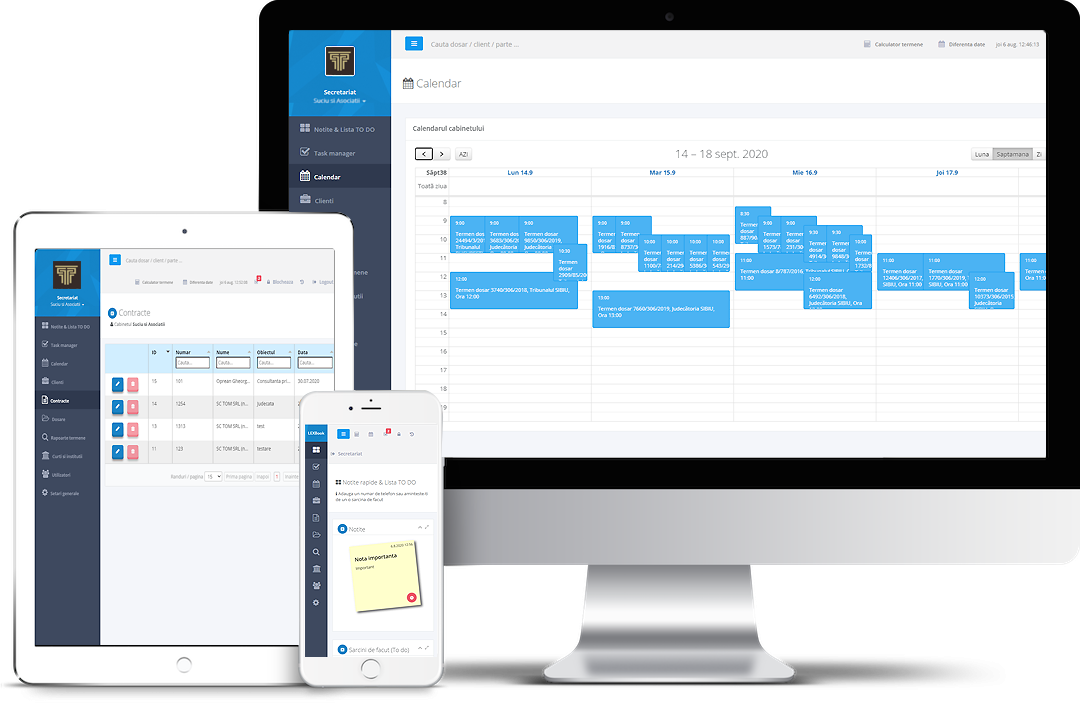 Ai acces la: calendar, clienți, contracte, fisiere, activități, șabloane, documente etc.